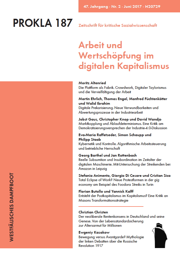 Butollo, Florian/Engel, Thomas (2015): Industrie 4.0 -- arbeits- und gesellschaftspolitische Perspektiven. Zwischen Dystopie und Euphorie. In: Z. Zeitschrift für Marxistische Erneuerung 26(103): 29-41.