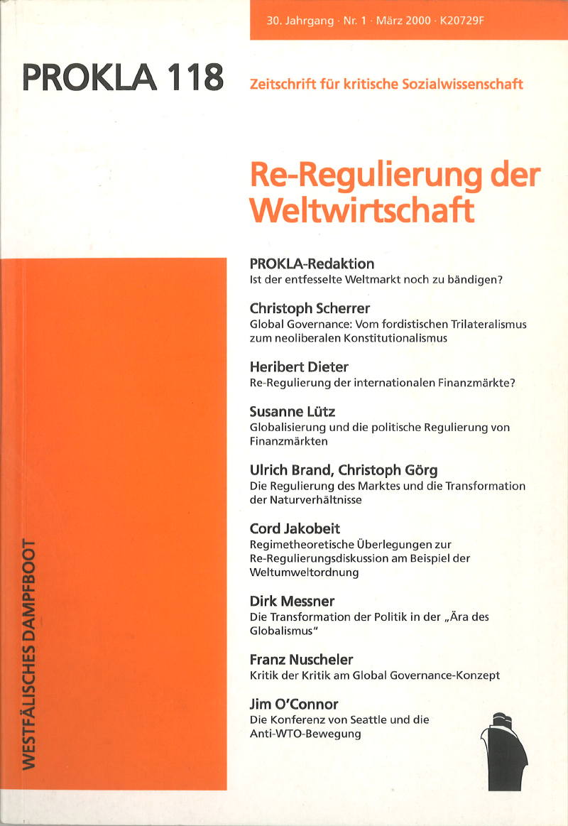The paper starts with a presentation and critique of regime theoretical approaches to the understanding of world economic developments after 1945. Within the debate on re-regulation, the normative-idealistic calls for a global environmental organisation seem to ignore what we have learned so far about the change and the effectiveness of international regimes. A fundamental regime change requires the consensus of the hegemon and/or the hegemonial group. And regime effectiveness does not primarily depend upon hierarchical organisational structures. Rather than advocating a global environmental organisation, from an ecological perspective the reform-minded transnational discourse networks would be better adviced to work for the acceptance of ecologically oriented indicators for economic development within all existing organisations of the world economy.